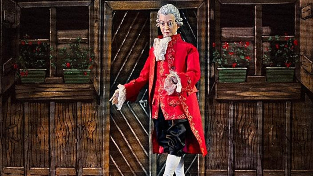 Der Komponist Wolfgang Amadeus Mozart – als Marionette – führt kindgerecht durch seine Oper