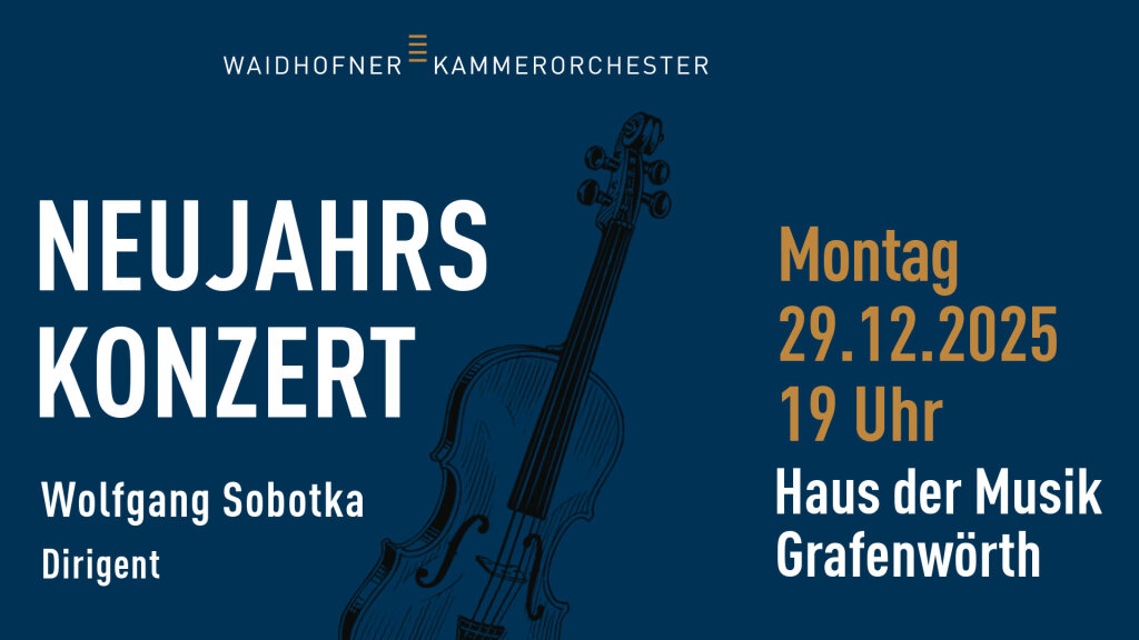 Dez 29 Montag, 29. Dezember 2025 Neujahrskonzert des Waidhofner Kammerorchester Haus der Musik Grafenwörth, Österreich #Klassisch 10 € - 25 € Datum & Uhrzeit Montag, 29. Dezember 2025 19:00 bis 22:30 Veranstaltungsort Haus der Musik Großer Wörth 7, 3484 Grafenwörth, Österreich Karte anzeigen Aktionen Event Teilen Tickets Informationen Eventdetails Marktgemeinde Grafenwoerth Veranstalter von Neujahrskonzert des Waidhofner Kammerorchester Zur Website des Veranstalters Veranstalter kontaktieren Karte anzeigen Adresse Haus der Musik Großer Wörth 7, 3484 Grafenwörth, Österreich Wegbeschreibung Datum & Uhrzeit Montag, 29. Dezember 2025 19:00 bis 22:30 Veranstaltungsort Haus der Musik Großer Wörth 7, 3484 Grafenwörth, Österreich Karte anzeigen Online Tickets Normalpreis Vorverkauf25,00 € Senioren Vorverkauf20,00 € Schüler & Studenten10,00 €