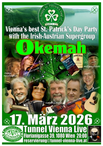 In der Vergangenheit haben Okemah zwei CDs mit irischen Songs veröffentlicht, im Vorjahr die CD „Wiener Blues“. Insgesamt gibt es mehr als 20 Veröffentlichungen der schon seit 45 Jahren existierenden Band, die mehrmals auf Tournee in den USA, Irland.und anderen europäischen Ländern waren. Ein ganz außergewöhnlicher Abend zum St. Patrick’s Day ist garantiert.