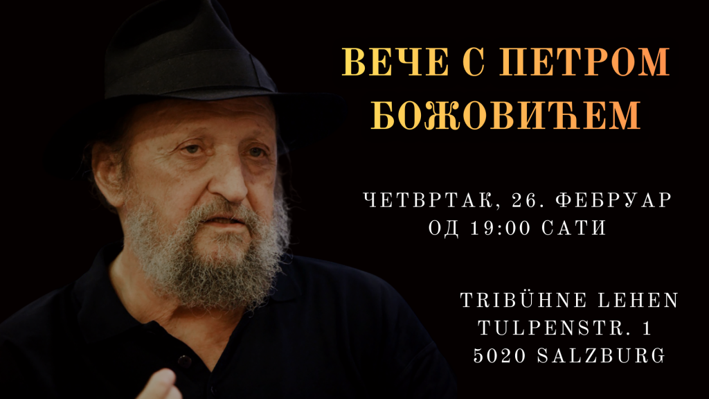 Gostovanje legendarnog srpskog glumca Petra Božovića u Salcburgu donosi publici jedinstveno veče snažne glumačke reči, emocije i umetnosti, u susretu sa jednim od najznačajnijih umetnika našeg prostora.