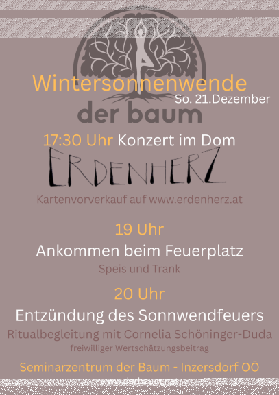 Dez 21 Sonntag, 21. Dezember 2025 Erdenherz WintersonnwendKonzert im Dom Seminarzentrum "Der Baum" Inzersdorf OÖ Inzersdorf im Kremstal, Österreich 0 € - 25 € Datum & Uhrzeit Sonntag, 21. Dezember 2025 17:30 bis 19:00 Veranstaltungsort Seminarzentrum "Der Baum" Inzersdorf OÖ Am Inslingbach 17, 4565 Inzersdorf im Kremstal, Österreich Karte anzeigen Aktionen Event Teilen Tickets Informationen Eventdetails Erdenherz Veranstalter von Erdenherz WintersonnwendKonzert im Dom Zur Website des Veranstalters Veranstalter kontaktieren Karte anzeigen Adresse Seminarzentrum "Der Baum" Inzersdorf OÖ Am Inslingbach 17, 4565 Inzersdorf im Kremstal, Österreich Wegbeschreibung Datum & Uhrzeit Sonntag, 21. Dezember 2025 17:30 bis 19:00 Veranstaltungsort Seminarzentrum "Der Baum" Inzersdorf OÖ Am Inslingbach 17, 4565 Inzersdorf im Kremstal, Österreich Karte anzeigen Online Tickets Freie Platzwahl Seminarraum Dom25,00 € Freie Platzwahl Seminarraum Dom Kinder0,00 €